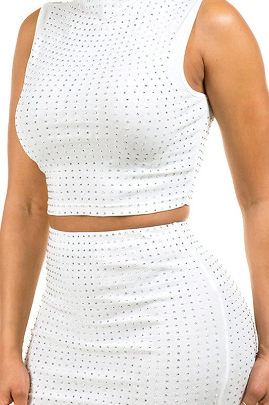 HIGH NECK CROP TOP RHINESTONE SILVER WHITE BLOUSE #T