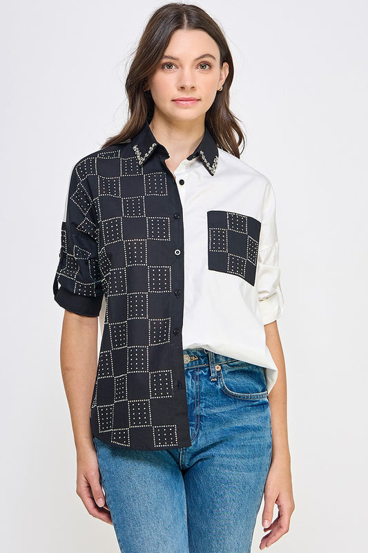 RHINESTONE DETAIL COLOR BLOCK SHIRT #A