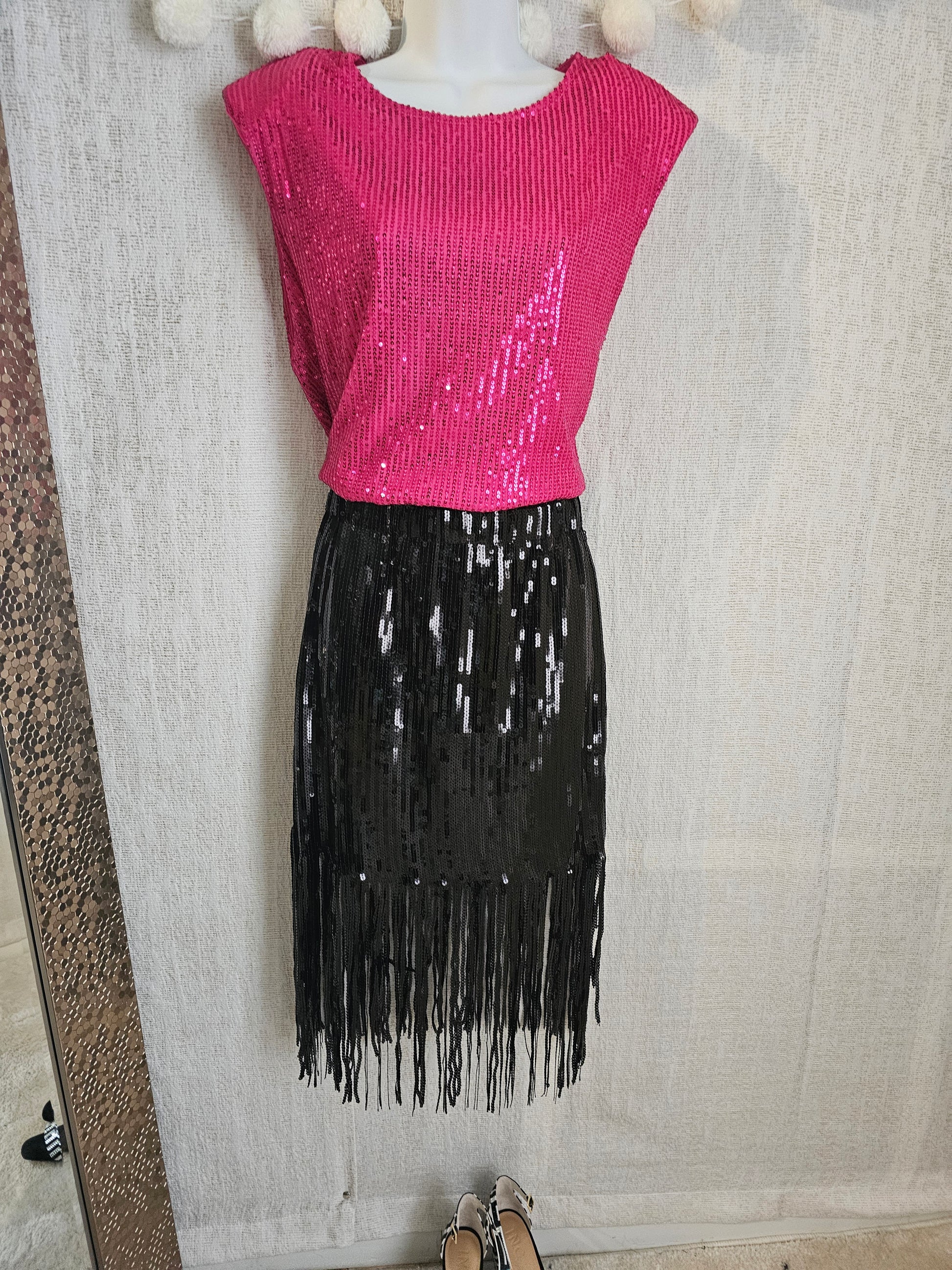 Black Sequin Fringe Midi Skirt, Falda de lentejuela #B