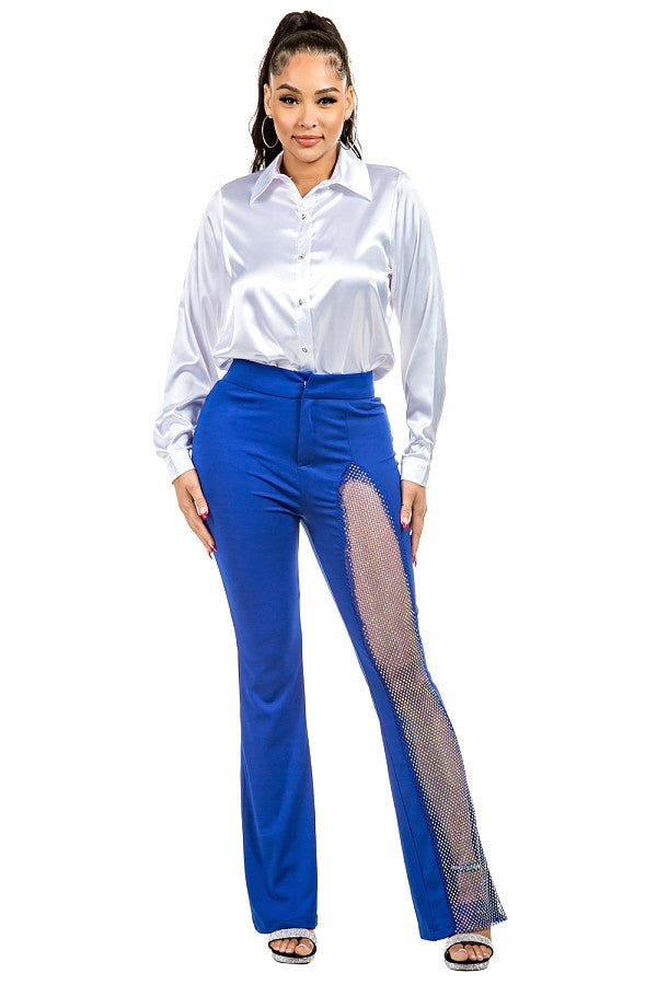 CONTRAST RHINESTONE-MESH FLARE PANTS - Solid and Rhinestone-Mesh contrast accent - Slim & Flare pants NO POCKET