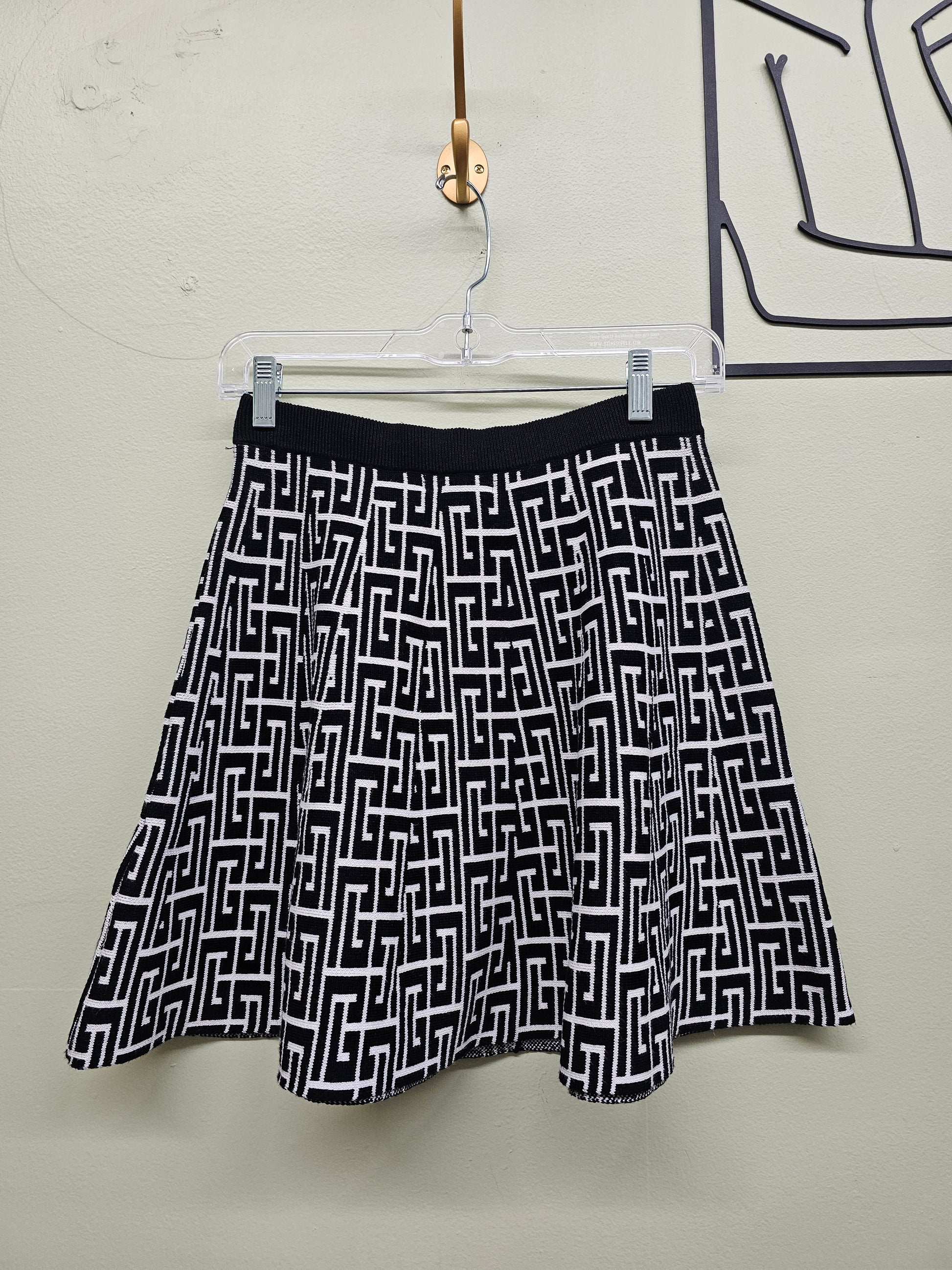 The Vero Mini Skirt features a striking white and black geometric pattern. It is adorned with gold buttons, adding a touch of elegance. The skirt's design is both bold and versatile, making it a great addition to any outfit.